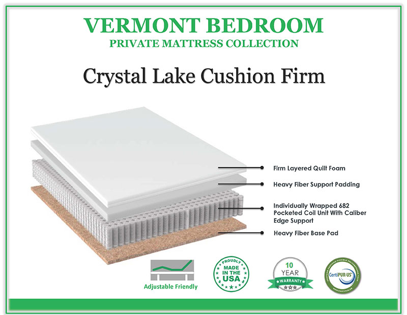The Crystal Lake Cushion Firm mattress provides comfort and sound support using a quality 682 individually wrapped pocketed coil with a Caliber Edge Supports. This body contouring unit offers support unlike traditional innersprings as well as “Zero Motion” transfer for those restless sleepers. Featuring environmentally conscious fiber pads and a firm support quilt. All these features, along a 10 Year Non-Prorated Warranty prove to be an exceptional value! Adjustable friendly. Made locally in Massachusetts.