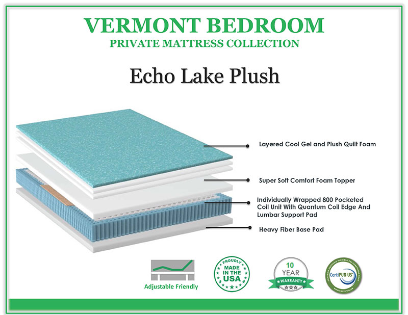 The Echo Lake Plush mattress provides plush comfort and sound support using a premium 800 individually wrapped pocketed coil with active edge support. This body contouring unit offers support unlike traditional innersprings as well as “Zero Motion” transfer for those restless sleepers. Featuring layered cool gel and plush quilt foams, a lumbar support pad and environmentally conscious fiber pads. All these features, along a 10 Year Non-Prorated warranty prove to be an exceptional value! Adjustable friendly. Made locally in Massachusetts.