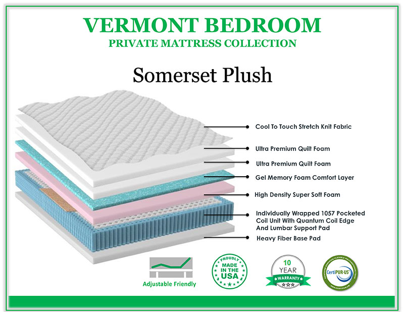 The Somerset Plush mattress provides plush comfort and sound support using a premium 1057 individually wrapped pocketed coil with active edge support. This body contouring unit offers support unlike traditional innersprings as well as “Zero Motion” transfer for those restless sleepers. It features a cool to touch cover, high density quilting foams, a gel memory foam layer, a lumbar support pad, a layer of high density super soft support poly foam and environmentally conscious fiber pads. Quality, value, and luxury along with a 10 Year Non-Prorated warranty makes this a strong option. Adjustable friendly. Made locally in Massachusetts.