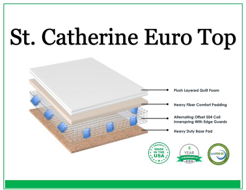The St. Catherine mattress provides plush support and affordable comfort featuring plush support quilt foam, a breathable cover, environmentally conscious heavy fiber pads and a 460 verti-coil spring system with edge guards for premium support. Made locally in Massachusetts. This mattress carries a 5 year non-prorated warranty.